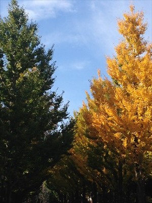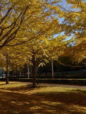 産総研敷地内のイチョウは木によっては半分くらい散っていて、終わり間近という印象。しかし落ち葉はまだ黄色くてくすんだ色にはなっていなかった。