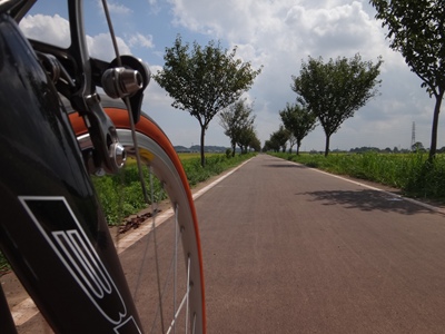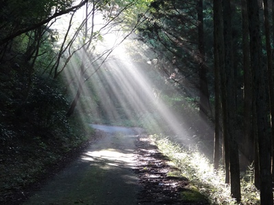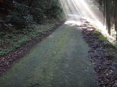 木漏れ日がシャワーのように降り注いでいました。でも路面は緑色(コケ)です。幸い湿っているところが少なくて助かりました。それでも立ち漕ぎすると滑ります。