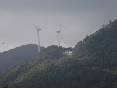 ウインドパワーつくば風力発電所の巨大風車。ここまで来れば、あとはきつい登りはありません。今日は風がまったくなくて止まっていました。おにぎり1個を補給。