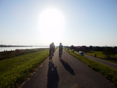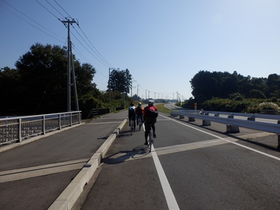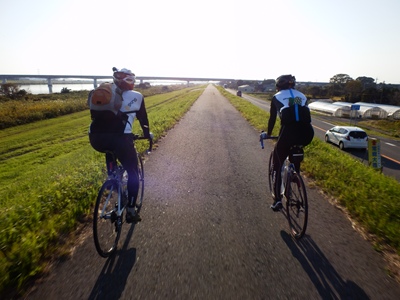水郷大橋の手前で成田から輪行するdadashinさんと別れ、テガさん、kincyanさんと利根川を遡上しました。予報より西風が弱くて助かりました。