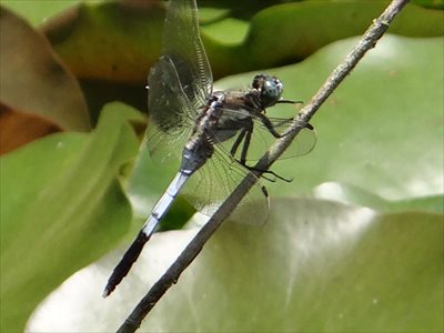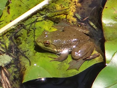 フラフラになってやっとたどり着いた熱田ヶ池で最後の休憩、半分水に浸っているカエルが羨ましい。ウシガエルの子供かな。