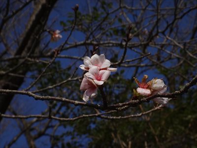 さくらの木の下でカメラを向けている人がいます。近づいてみると、その木だけ咲いています。膨らんでいる蕾もたくさんあります。