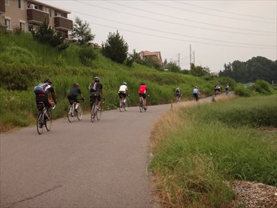 ワンチャンさんの「こだわりの自転車を見せていただきまーす!」という呼びかけで、10余台の自転車が手賀大橋下に集まりました。