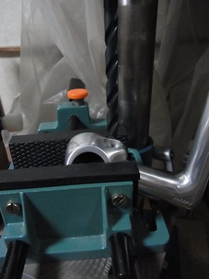 次にヘリサート用のタップを立てます。タップハンドルがコラムに引っかかってやりにくいです。6.35sqのエクステンションバーが使えたので、刃が噛んでからはそれを使用しました。