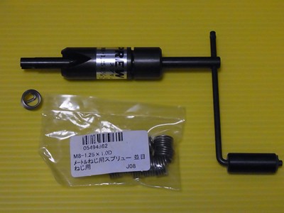 最初のスプリングのような写真、これはヘリサートとかスプリュー、リコイルなどと呼ばれるねじ山(雌ねじ)を補強するものです。元のねじの谷径が山径となる一回り大きい(ピッチは同じ)タップを立てて、ヘリサートを入れます。材質はSUS304(たぶん)、アルミより高強度、ヘリサートを入れるとこにより弱い母材が雄ねじとの接触せず、こすれることがありません。樹脂などにも使います。