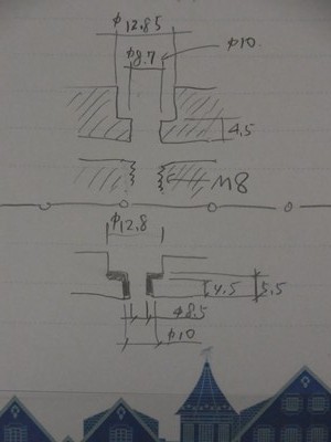 この時までに元々ねじの通る穴(下側)は、ヘリサート用のタップが通らなければならないので、φ8.7だったのもをφ10.0に広げています。