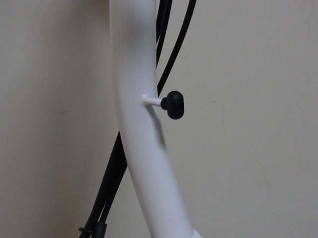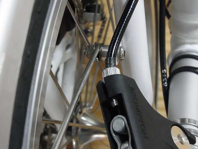 折りたたむと小さく四角くなるのがBROMPTONの魅力ですが、デフォルト状態のブレーキレバーはかなり下を向いています。握りづらいのでレバーを前に出すと、折りたたんだ時にいろんなところと干渉します。キャッチャー(ストライカー?)を調整すればある程度緩和できますが限度があるし折りたたみサイズが大きくなります(ほんのちょっとですが)。