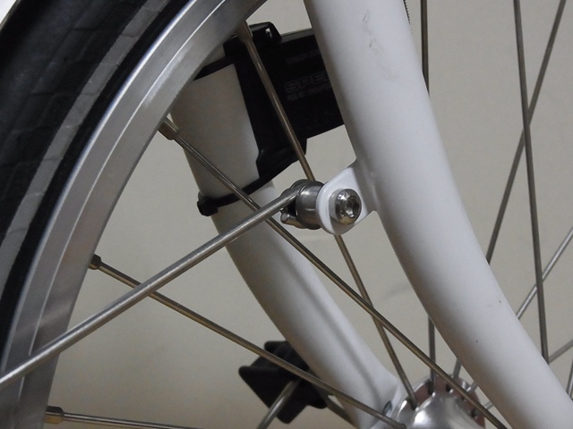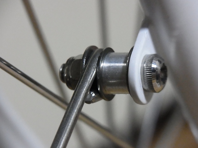 で、一番最初に当たる泥除けステーにスペーサーを入れて内側にずらしてみました。ボルトも長いものに替えています。