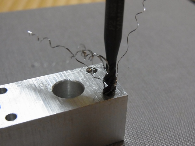 スパイラルタップという、ねじれた溝のタップを使いましたが、普通のタップ(ポイントタップ)と違い切子が手前に出てくるので、止まり穴でも一気にねじが立てられます。