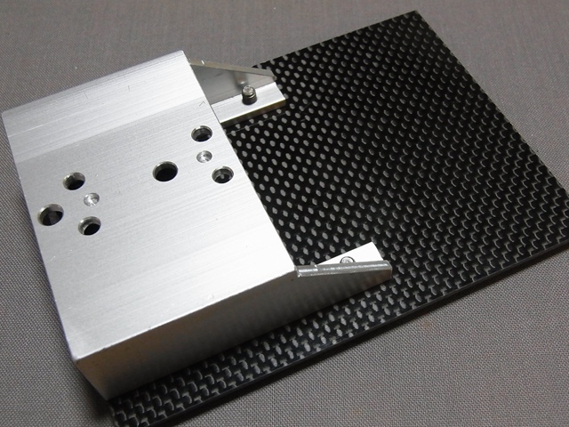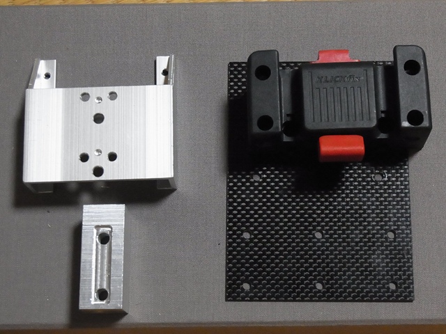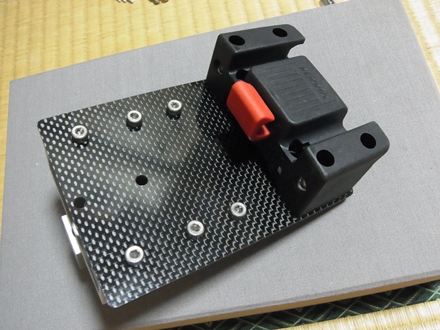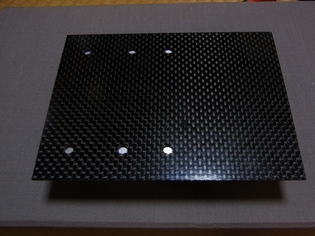 Cチャンとアタッチメントはカーボンプレートを介して取り付けることにしました。外形を切り出して、穴を数箇所あけました。Cチャンとカーボンはこのように組み立てます。