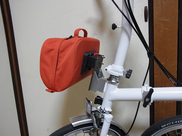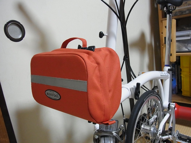 普段乗りにもっと小さい入れ物が欲しくなりました。以前ロードに付けていたモンベルのフロントポーチがちょうど良さそう。携帯工具と輪行袋とドリング+αが入ればいい。オプションのフロントキャリアブロックの代わりにモンベルのアタッチメントが付けられればBestです。