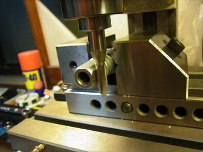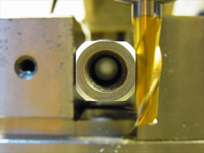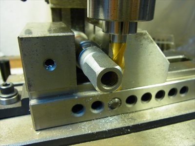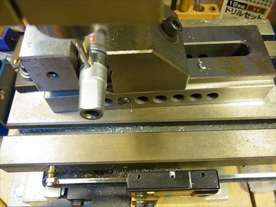 テーパー面を削るに当たり、フライス盤をちょこっといじります。送り台にセットしてある材料固定のバイスを、2度傾けてテーパー面を送り台の動きと平行にします。この状態で軸を固定すれば軸の芯は2度傾き、削る面が前後軸と平行になります。NC(CNC)じゃ無いので、エンドミルを滑らかに斜めに動かすことはできません。もっとも今回の場合はNCでも冶具を傾けたほうがいいでしょうが。