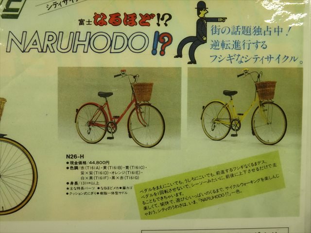 これは初めて知りましたが、1983年に日米富士自転車から市販されていたシティサイクル「NARUHODO」。クランクを前に回しても後ろに回しても前に進む「なるほどメカ」を搭載しています。リアディレーラーのようなものが突き出ており、チェーンが複雑にルーティーンされていてハブに2回巻き付いていて、それぞれのスプロケが正転・逆転を受け持つようです。コースターブレーキもそうですが、発進時に踏み込みやすいようにクランク位置を逆回転させて合わせるときに困っちゃいますね。