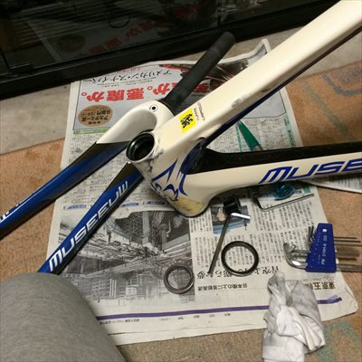 持ち込まれたときに、ハンドルを切ると多少音がしたのでヘッド周りをを分解・グリスアップした。多少砂などがあったもののベアリングの外側で、状態は1年半前と変わらなかった。