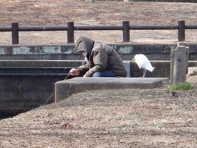 次に見たのはこんな光景、「サギ(たぶん)とおじさん(だと思う)」。