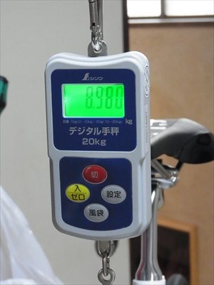 車重を再測定、装備品はペダル・スピードセンサー・バーエンドミラー・テールライトです。アナログ時計・ボトルケージは外しました。8.98kg、おー、9kg切った。