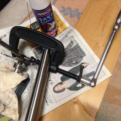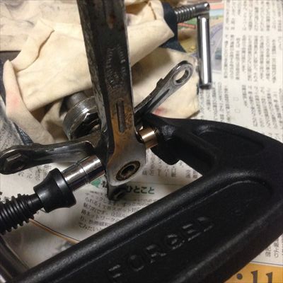 その日のうちにBB周りに手をつけました。やれるかやれないかの判断をしなければなりません。クランクを外すにはコッターピンを外します。まず左側、バイスを使って抜けました。そして右側、かなり手強いです。安物バイスが割れました。