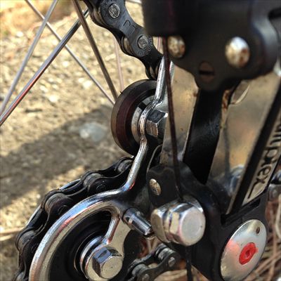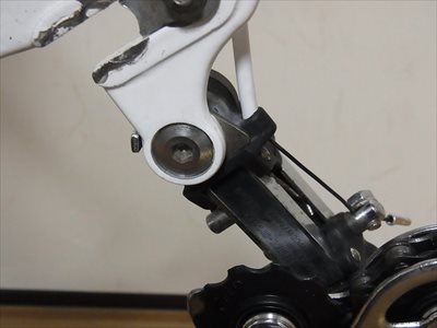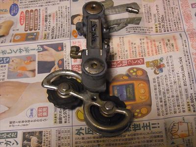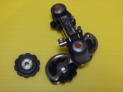 ・RDはHi、Loのストッパーねじの受け部分の樹脂にひびあり。が、使えると判断。リアメカハンガーの形状が現在のものと違うため、最近のRDとは単純に置き換え不可。割れているテンションプーリーはエポキシ接着剤で補修したが、安全のため交換することに。社外品(BBB)のプーリーだが、取付けの厚み・取付けボルト径が現行のもと異なるためにブッシュを製作