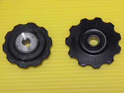 途中でテンション側と同様に変速プーリーが割れました。自走可能だったのでそのままリアは変速しないように家まで戻ってきて、早速補修をしました。もともと両方とも10Tだったので11Tが入るか心配でしたが大丈夫そうです。これでプーリーの不安要素が消えました。