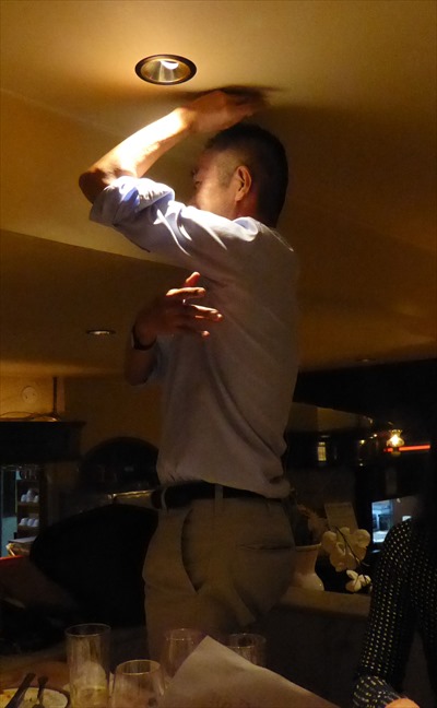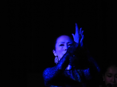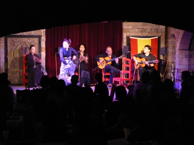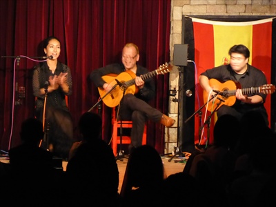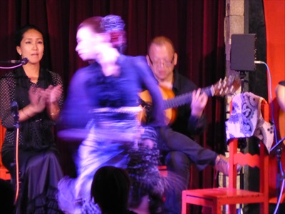 カンタオーラ(歌い手さん)・パルマ(手拍子)・ギターそして踊り手、全員真剣勝負である。さして広くないステージをしなやかに、そして力強く舞うバイラオーラ(女性の踊り手さん)は圧巻である。そんな中、Rieさんは10分間をソロで踊り切った。料理も美味しかったが、踊りの最中は料理など食べている場合ではなかった(暗かったし)。